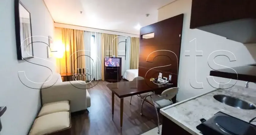 Studio mobiliado e equipado no Flat Transamerica Nações Unidas, com 28m², 1 dormitório, sala aconchegante e cozinha americana planejada.