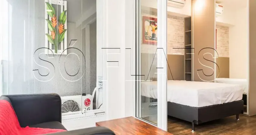 Apartamento no moderno modelo Studio, mobiliado e equipado, com 35m² distribuídos em 1 dormitório, linda varanda fechada com vidro, cozinha americana e 1 vaga de garagem.