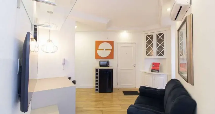 Studio com 42m² totalmente mobiliado e equipado, 1 dormitório, sala aconchegante, cozinha americana funcional e 1 vaga de garagem. Planta inteligente que atende perfeitamente moradia prática ou investimento com alta liquidez em Moema.