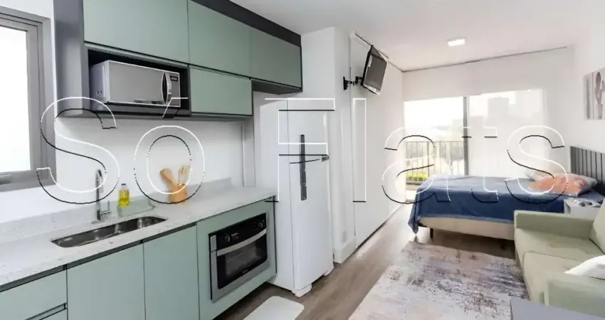 Apartamento no modelo Studio, mobiliado e equipado com 36m² distribuído em 1 dormitório, mesa para trabalho, varanda e cozinha americana.