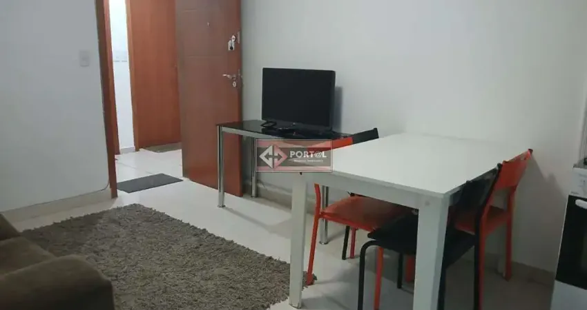 Flat 01 quarto com armário planejado, cama de casal e espelho, banho social com armário, espelho e box Blindex, cozinha estilo americana com armários, fogão, geladeira, mesa com cadeiras, lavanderia com maquina de lavar roupas, varanda com guarda corpo em Blindex.