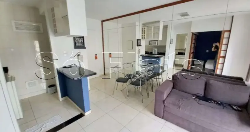 Flat mobiliado com 1x dormitório em Moema, quarto e sala em cômodos separados e varanda. Sem fiador.