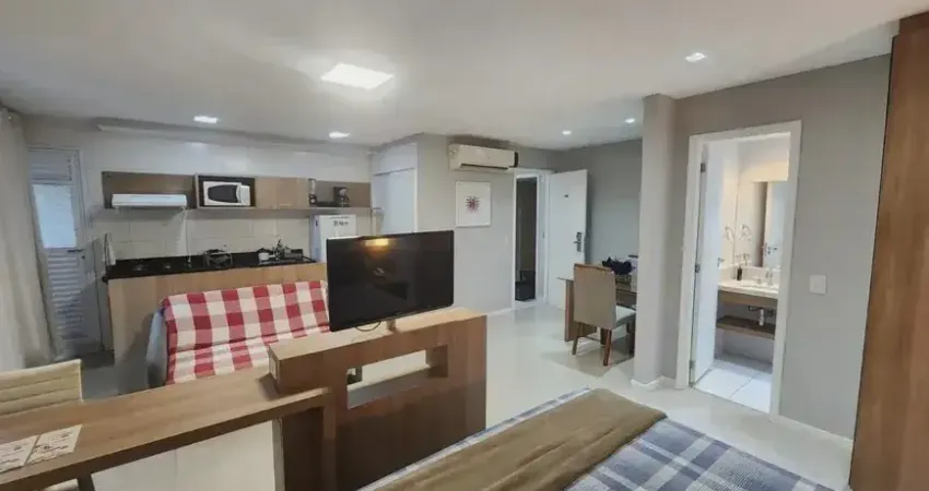 Possui armário, cama de casal, sofá cama, cozinha com todos os seus utensílios, estação de trabalho, ar condicionado split, TV, geladeira, banheiro, wi-fi próprio e também do condomínio disponível e vaga de garagem no parqueamento.