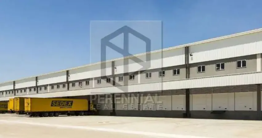Armazém com extensa plataforma de docas, pé direito alto, piso de alta capacidade de carga e iluminação natural, que confere maior economia e eficiência energética.