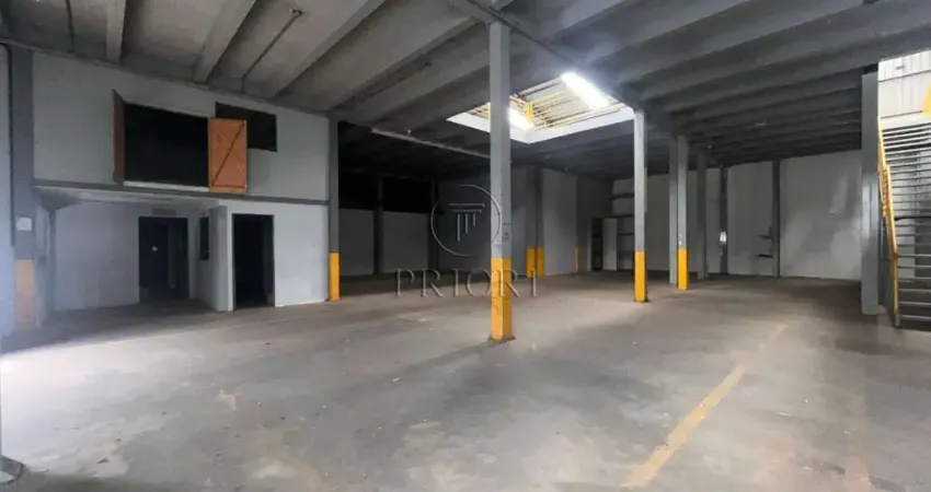 Depósito com 1500m² de área privativa, pé direto alto, mezanino com espaço para armazenamento e salas para escritórios, banheiros e vestiários, vagas de estacionamento lateral.