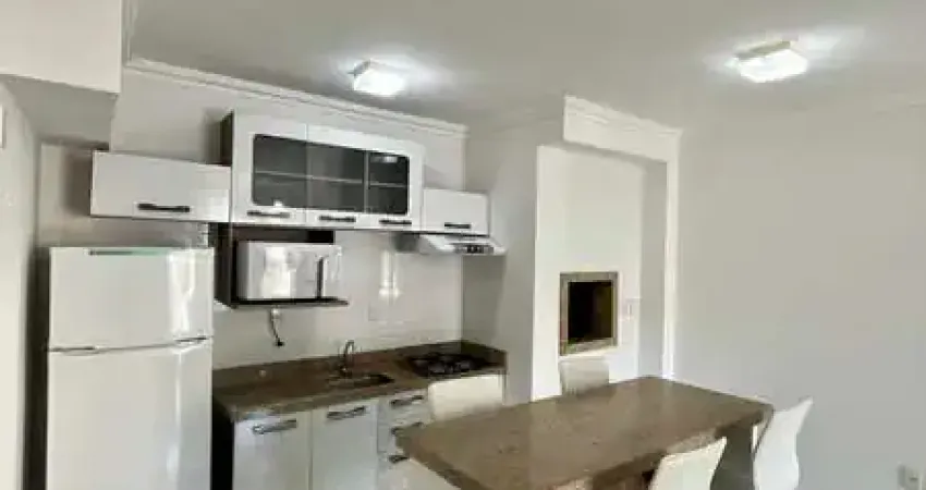 Apartamento com 2 dormitórios, 1 banheiro, cozinha com churrasqueira, sala de estar e jantar, varanda fechada com lavanderia, possuindo mobília.