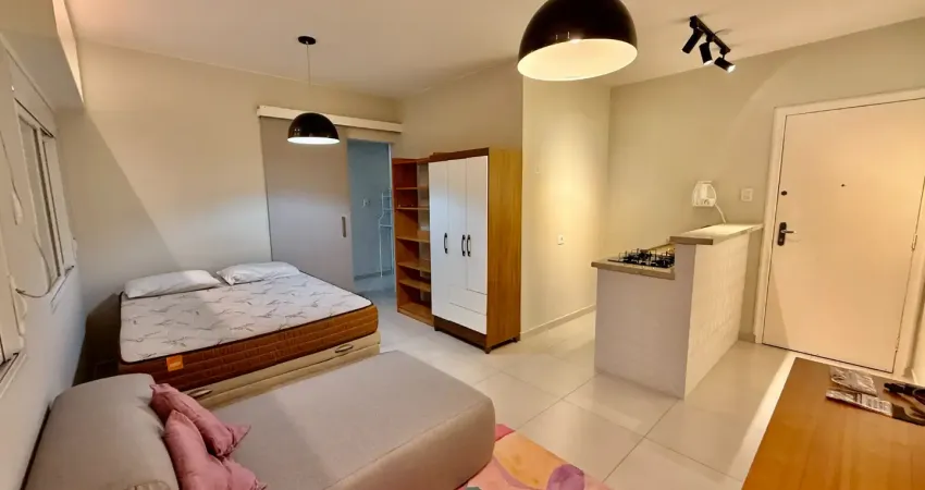 Venha morar na quadra da praia, em um sala living mobiliado com cozinha estilo americana e banheiro social.