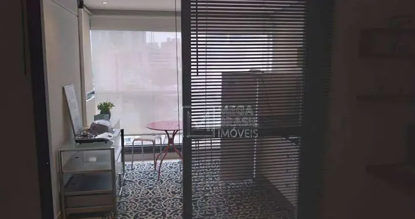 Excelente studio com 33 metros, distribuído em 1 suíte, sala integrada com cozinha americana, andar alto, varanda com vista livre, mobiliado.