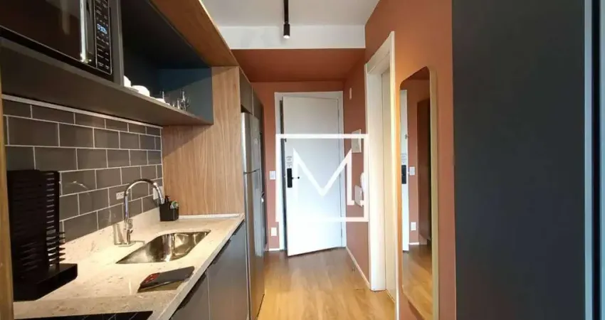 Studio com sala, quarto, banheiro, cozinha e varanda, todo mobiliado com armários planejados, eletrodomésticos e TV, pronto para morar.