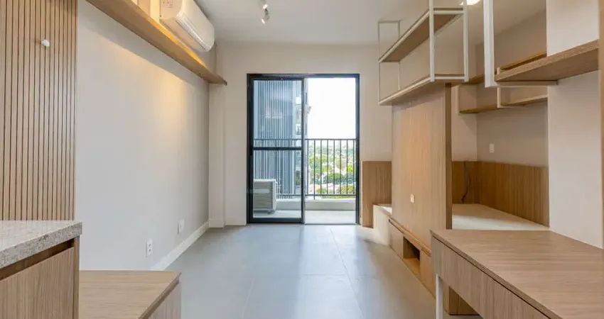 O studio conta com ar condicionado e armários planejados na cozinha, no dormitório e no banheiro, garantindo organização, otimização do espaço e um visual moderno. A varanda é um diferencial importante, trazendo mais ventilação, iluminação natural e um espaço agradável para relaxar.