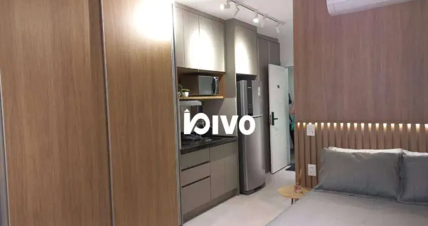 Studio completo, com armários planejados, ar condicionado, cama de casal, sofá, geladeira, microondas, fogão elétrico, depurador de ar, filtro de água, lava e seca roupas, TV, aquecimento de água a gás, fechadura eletrônica,
