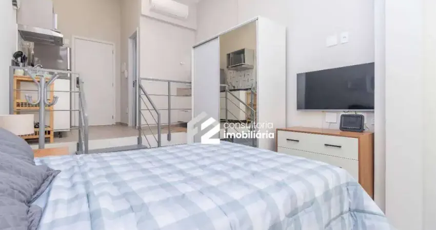 Studio de 26 m², extremamente bem planejado e funcional, oferecendo total autonomia para quem busca praticidade, conforto e bom gosto. Pronto para morar, o imóvel se destaca pelo pé-direito duplo, que proporciona maior sensação de amplitude, aliado a janelas do piso ao teto, garantindo excelente iluminação natural.