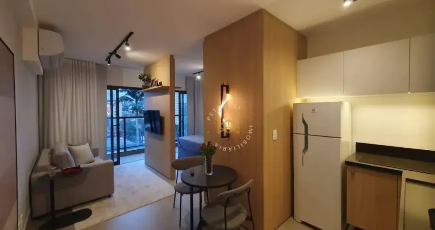 Studio de alto padrão com 39,3m², composto por 1 quarto, sala integrada à cozinha e banheiro social com ducha. O imóvel apresenta projeto moderno, totalmente decorado e mobiliado em design contemporâneo. A sala conta com sofá-cama e TV 50, enquanto a cozinha é equipada com cooktop, micro-ondas, geladeira e mesa para 2 lugares. A varanda possui vista livre com sol da manhã, proporcionando luminosidade e um espaço agradável para relaxar. O quarto dispõe de cama baú, armário embutido e roupeiro, e o banheiro conta com ducha aquecida a gás. O imóvel possui ar-condicionado e 1 vaga coberta fixa. Todos os móveis são planejados, e a sacada integrada amplia a sensação de conforto e oferece uma vista encantadora da cidade.