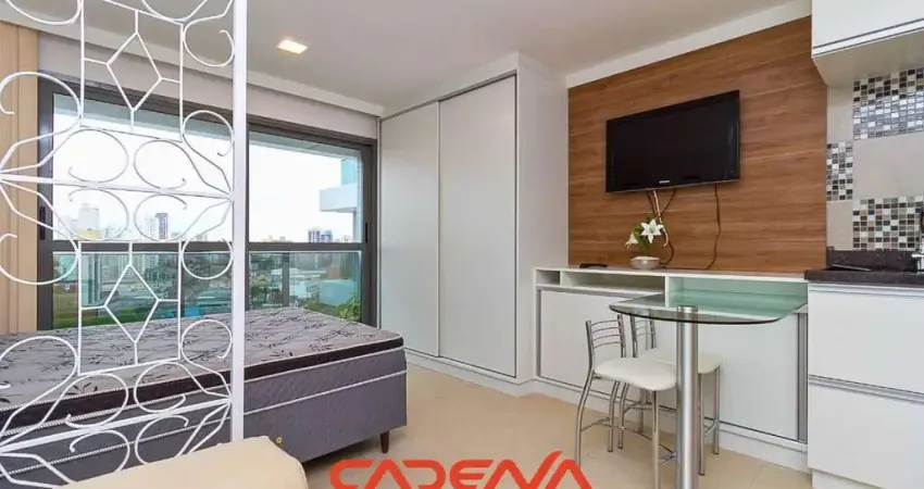 Apartamento studio, com ambiente open space mobiliado, composto por cozinha planejada, quarto, sala de estar, bwc e varanda com vista livre para uma das regiões mais privilegiadas de Curitiba!