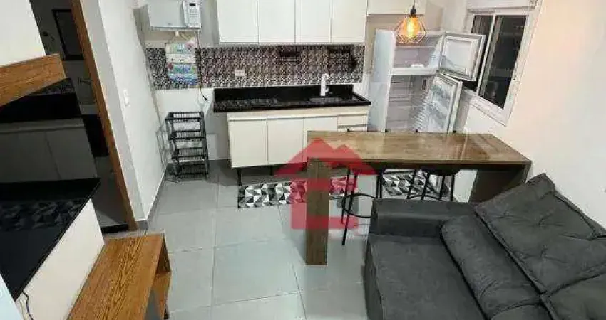Flat mobiliado para locação em Cotia. Imóvel com 2 Dormitórios com cama, guarda-roupa, painel e televisão, Sala com sofá, painel rack, televisão, Cozinha com balcão, banquetas, micro-ondas, armário e gabinete, geladeira, fogão de indução.