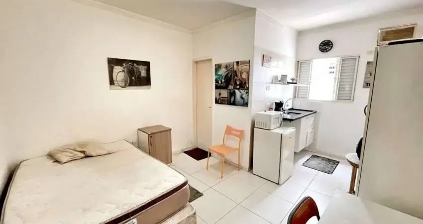A kitnet é mobiliada conforme as fotos e possui cerca de 20 m², distribuídos em um único ambiente com banheiro privativo. No valor da locação já estão inclusos água, Wi-Fi e IPTU; apenas a energia elétrica é cobrada à parte, com medidor individual para cada unidade.