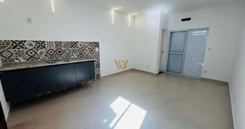 KITNET NOVA ( 1° morador ) em condomínio recém construído, sendo amplo espaço aberto para sala, cozinha com gabinete, dormitório, 1 banheiro social e lavanderia privativa. O imóvel já está com infraestrutura pronta para instalação de ar-condicionado.