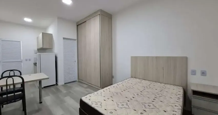 Kitnet mobiliada com 1 dormitóriosalacozinha, banheiro social, varanda, ar-condicionado, vaga de garagem para moto e lavanderia coletiva.
