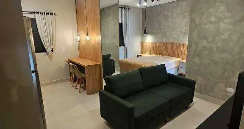Apartamento Stúdio 30 m² novo, mobiliado com geladeira, TV Smart, sofá, ar condicionado split, cooktop, máquina de lavar, micro ondas, cadeiras e cama. Armários planejados e um ótimo banheiro.