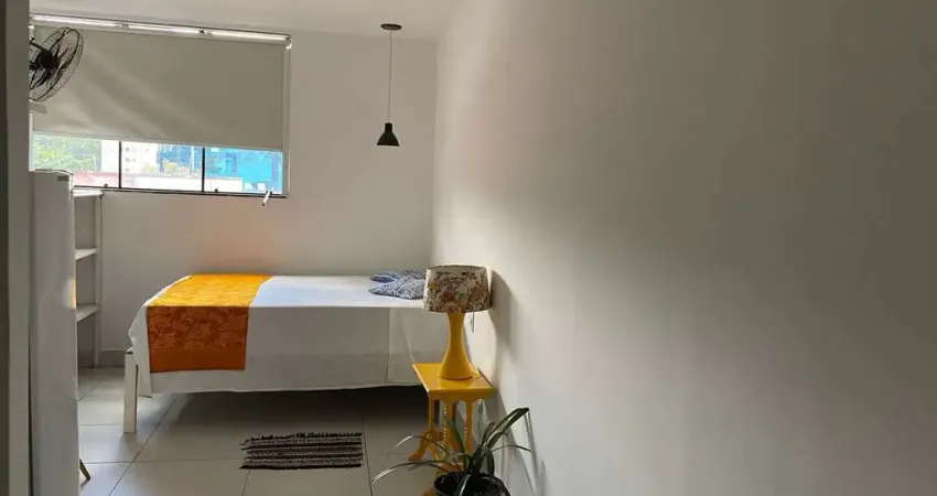 LINDA KITNET DE 25 M² COM 1 DORMITÓRIO, MOBILIADO ( CAMA DE CASAL, GELADEIRA, MICROONDAS ) E 1 BANHEIRO.