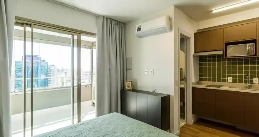 Totalmente mobiliado e decorado, o espaço foi planejado para quem exige conforto imediato: conta com dormitório integrado, banheiro moderno e uma varanda charmosa, ideal para relaxar após um dia de trabalho. Aqui, você entra apenas com as roupas.