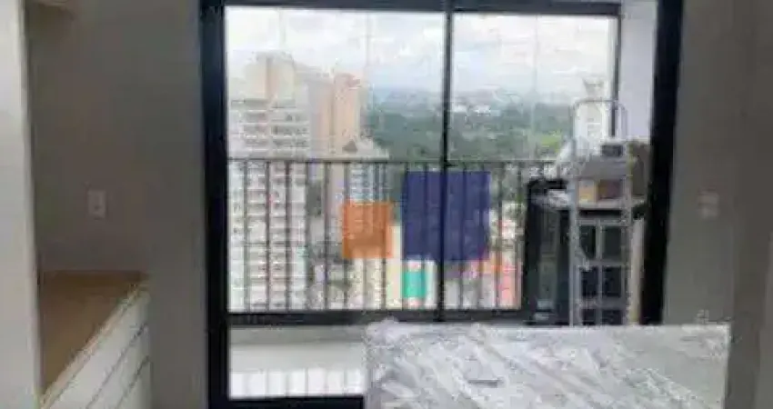 Studio, primeira locação, com ar-condicionado, cama box, geladeira, fogão elétrico, com armários embutidos e sacada envidraçada.