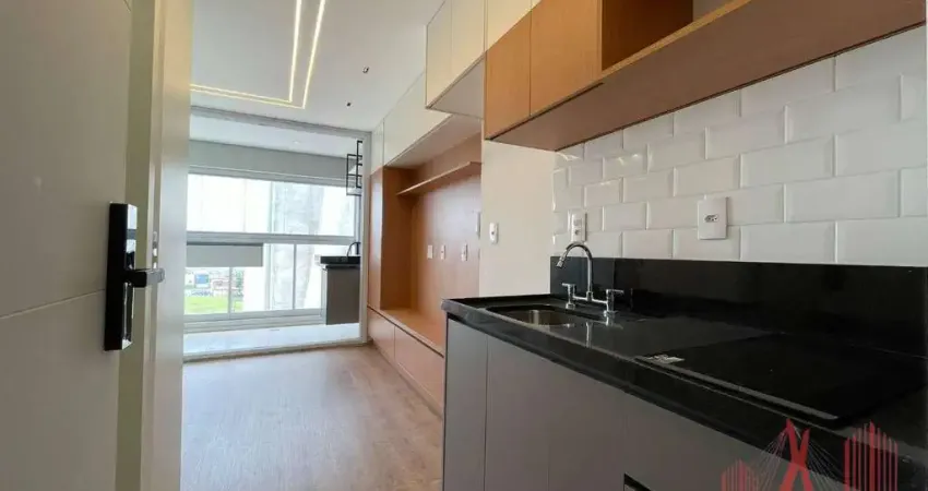 Studio SEMIMOBILIADO para locação no bairro Vila Clementino com 26 m², com 1 dormitório com guarda-roupas e painel de TV, 1 banheiro com box de vidro, cozinha com cooktop, varanda com fechamento em vidros, armários planejados, ar-condicionado, bem arejado e iluminado.