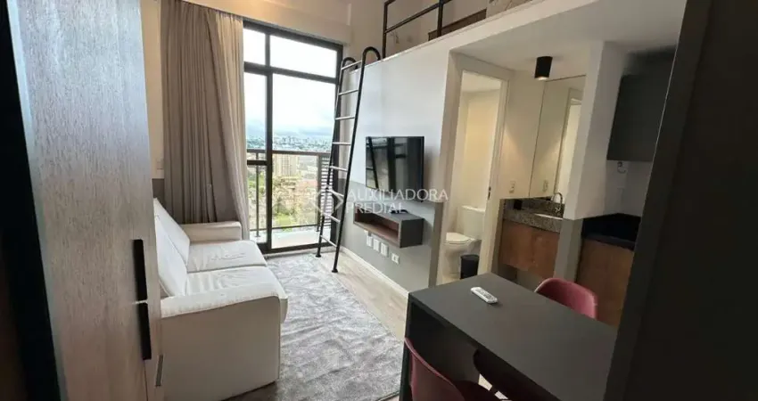 Studio com 25m² muito bem distribuídos, totalmente e finamente mobiliado, com acabamento sofisticado e decoração contemporânea. O grande diferencial está no pé-direito alto, que proporciona amplitude, iluminação natural e um toque exclusivo ao ambiente, além do quarto no mezanino, garantindo mais privacidade e excelente aproveitamento do espaço.