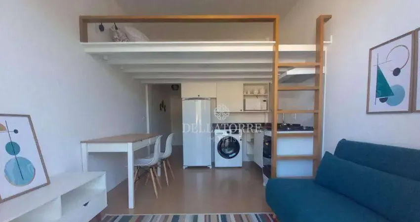Aluga-se loft 28m², de frente, com varanda, closet, com mobília. Recebe sol da manhã. Chuveiro e torneiras com aquecimento a gás.