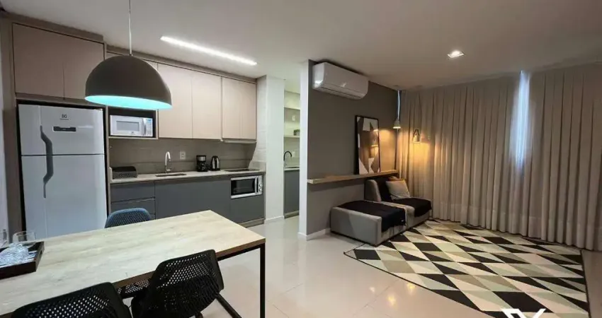 Apartamento, mobiliado, de ótima qualidade e bom gosto, contendo 45m², 01 dormitório, sala de estar, cozinha, área de serviços, banheiro social, com ar condicionado split na sala e quarto e 01 vaga de garagem.