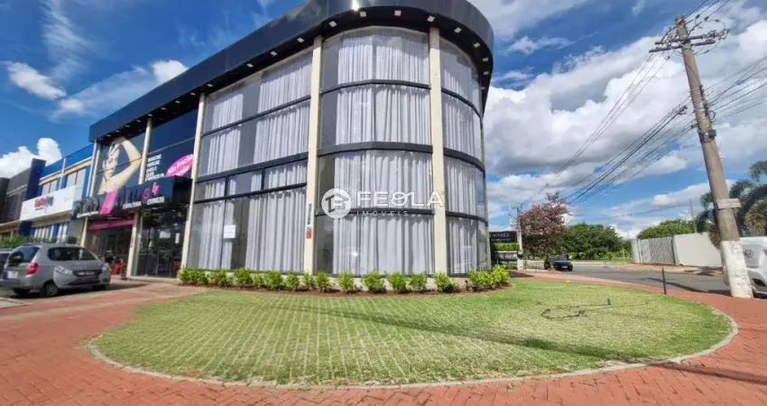 Salão comercial de esquina com 105m² de construção, todo em blindex, pé direito de 8 metros de altura, 2 banheiros e 2 vagas de estacionamento.