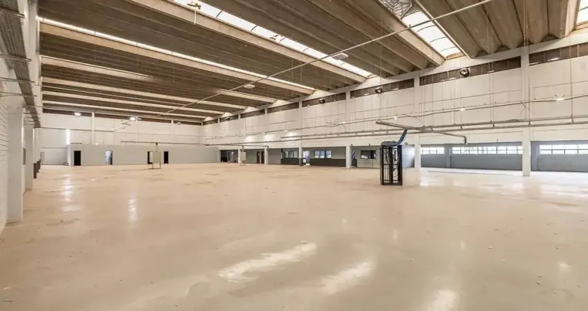 Recepção, amplo pavilhão com vão livre, pé direito de 10 metros, piso industrial, dois conjuntos de banheiros (masculino e feminino) e três portões para entrada de caminhões.