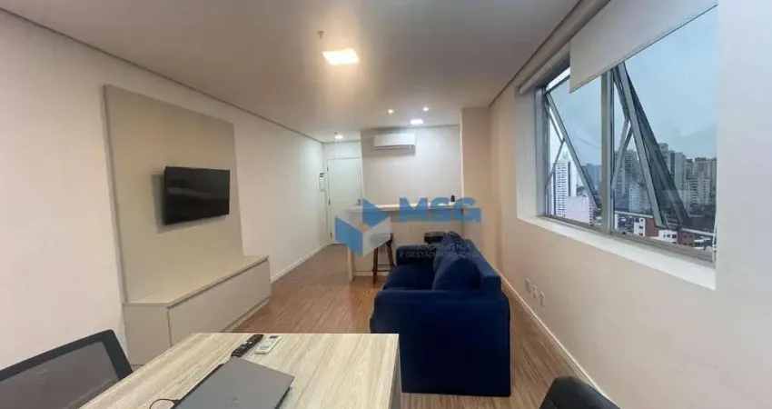 Sala comercial reformada e mobiliada, andar alto, banheiro com chuveiro e janela, copa planejada no estilo americano com mármore branco, piso laminado, ar-condicionado Inverter e 1 vaga de garagem com manobristas.