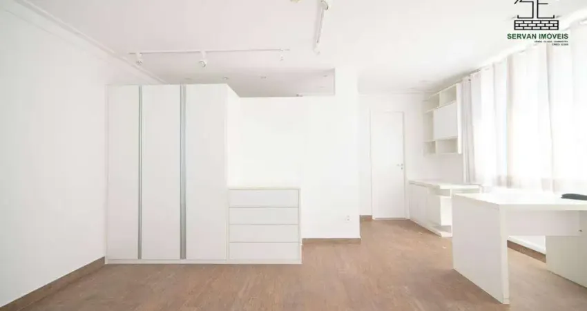 Sala com 40m² mobiliada com móveis planejados e sofá, ar condicionado e copa com armários planejados,