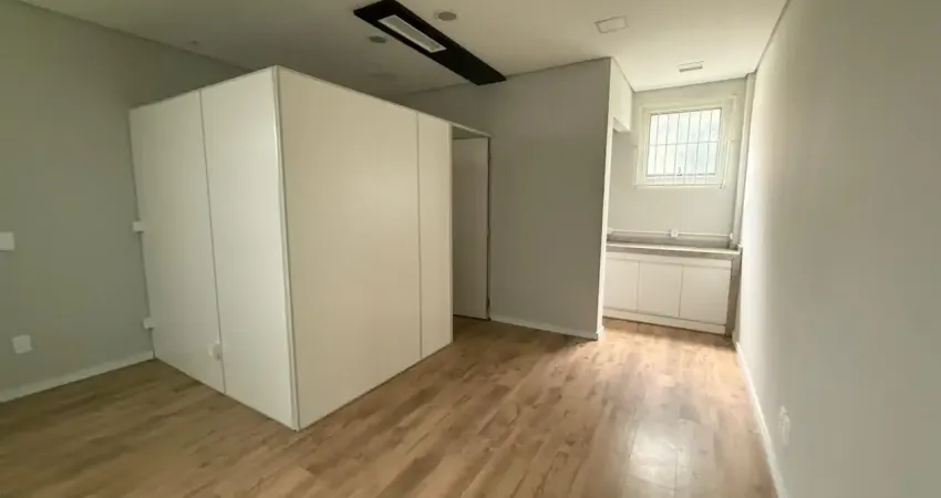 Sala privativa em galeria, com banheiro privativo e outro banheiro de uso comum adaptado para pessoas com deficiência. O espaço conta com piso laminado, rebaixo em gesso, copa no estilo cozinha com móveis sob medida, além de uma sala privada adicional que garante mais conforto. O banheiro privativo já possui móveis sob medida.