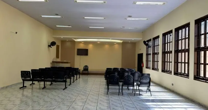 Amplo salão com palco elevado, ideal para eventos, cultos ou apresentações