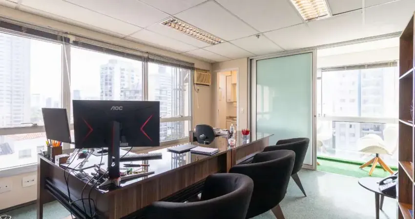 Conjunto comercial com 38m² muito bem distribuídos, contando com duas salas climatizadas com ar-condicionado, janelas do teto ao chão que garantem excelente iluminação natural, dois banheiros, sacada envidraçada e uma vaga de garagem.