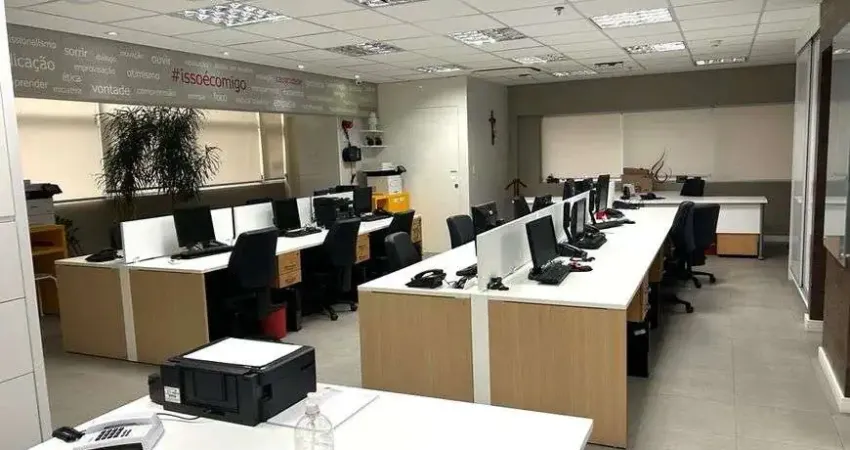 Recepção, amplo salão com baias, sala de reunião, 02 salas privativas com portas de correr de vidro, 04 banheiros e copa.