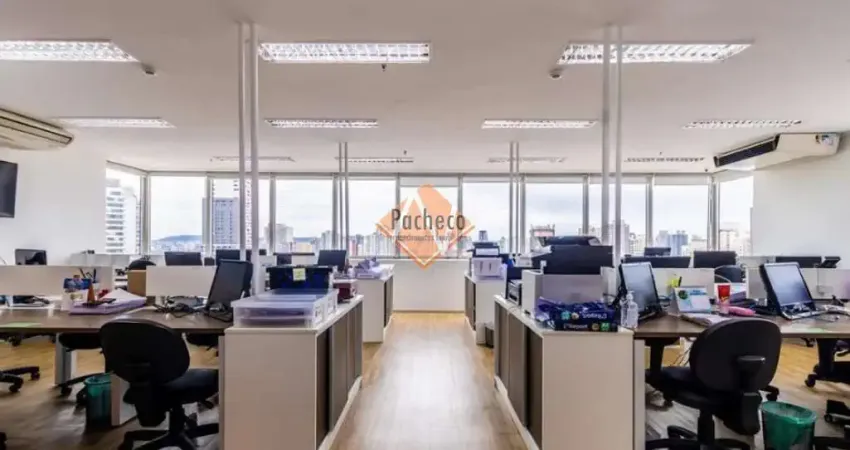 Sala comercial com 4 banheiros, copa, salas envidraçadas, sistema de infraestrutura e ar condicionado por todo o espaço.