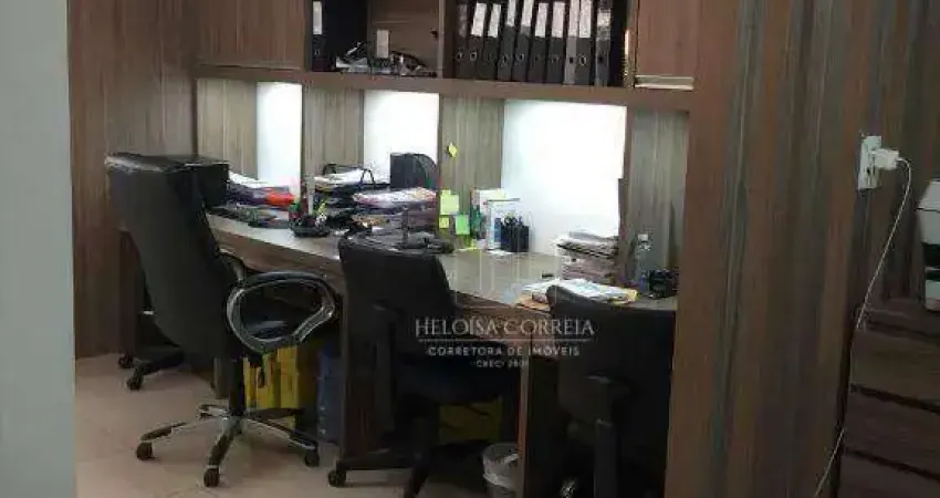 Sala comercial com 38 m², possui todos os móveis projetados, piso em porcelanato, 2 banheiros privativos revestidos com pastilhas, 2 aparelhos de ar condicionado split.
