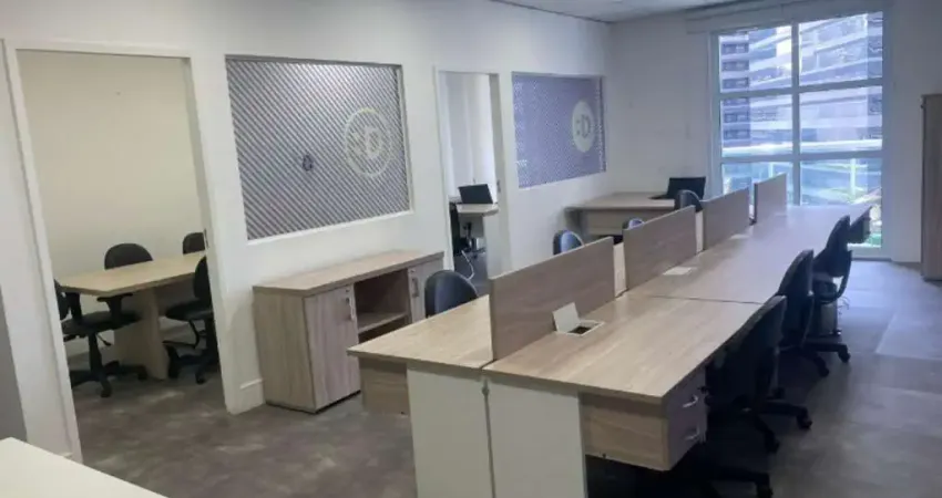 75 M2, 2 vagas de garagem, mobiliada, moveis novos, 16 posições de trabalho, Salas de reunião, sala de diretoria, ar condicionado,copa,dados de voz e elétrica instalados, copa, cercada d e armários