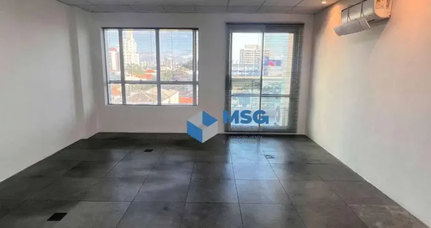 Sala de 37m² com piso elevado, luminárias, 1 banheiro, ar-condicionado Inverter e 1 vaga de garagem.