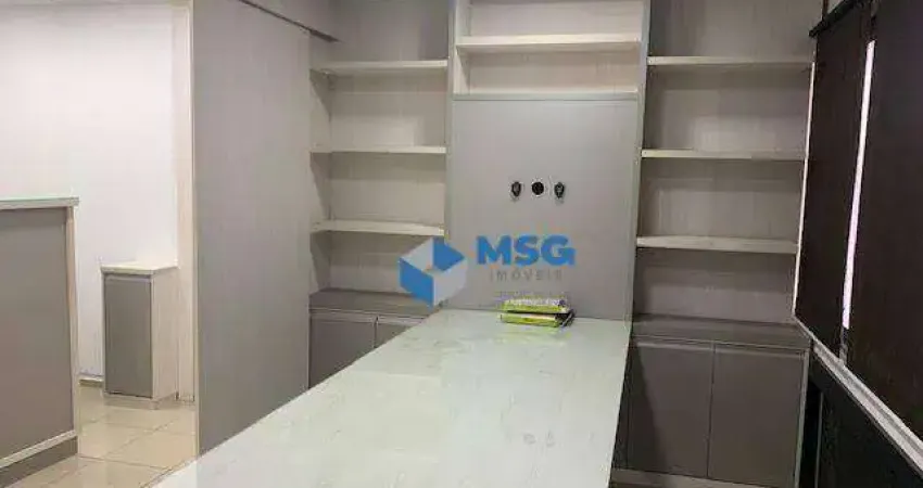 Conjunto comercial, 56m², subdividido em 4 ambientes, 2 vagas, 2 banheiros, copa, piso frio ar condicionado, e luminárias.