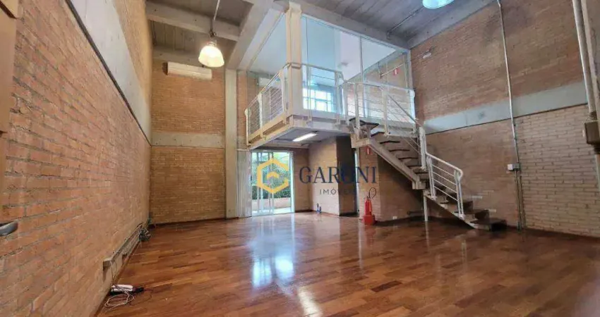 Sala com mezanino, 77,37 m² de área útil, ampla, bem arejada e iluminada. No piso inferior uma sala ampla em vão livre, ar condicionado, 1 banheiro com armário, pia e espelho, copa com armários e pia, varanda ampla e arborizada. Uma sala no mezanino com amplas portas de vidro e ar condicionado, sendo ideal para um escritório ou sala de reunião.