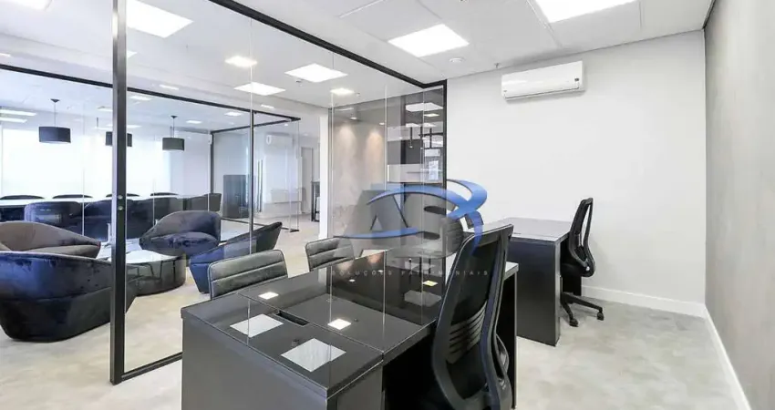 Conjunto comercial totalmente MOBILIADO para uso imediato. Com 135,50m², estações de trabalho com 12 posições, 3 salas de reunião/lounge, varanda, ar-condicionado, ótima iluminação natural, banheiros individualizados, copa, 3 vagas de garagem rotativas. Edifício com recepção corporativa, catracas eletrônicas, café, restaurantes dentro do complexo, localizada na região Brooklin.