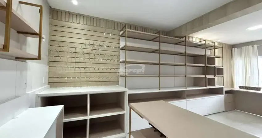 Ambiente moderno, organizado e projetado para otimizar atendimento e exposição de produtos. O espaço conta com mobiliário sob medida, incluindo estantes amplas com acabamento em dourado, balcão de atendimento, mesa de trabalho, armários planejados e vitrines em vidro – ideal para áreas de estética, beleza, consultoria ou serviços especializados.