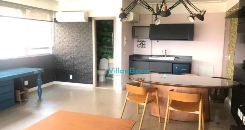 Excelente sala comercial de 43,33m² toda equipada. Possui copa, ar condicionado e mesas. Um banheiro e uma vaga de garagem.