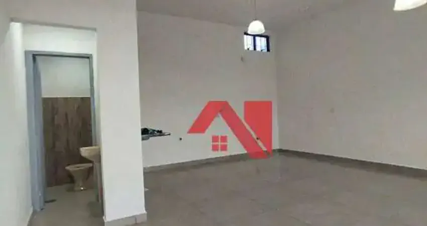 Salão comercial para locação com 40 m² e banheiro. Porta com controle remoto. Acabamento novo.
