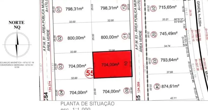 Lote excelente, voltado para o nascente, com 22 metros de frente, 32 metros de fundo e laterais de 32 metros. Terreno amplo, localizado em condomínio fechado com completa área de lazer.