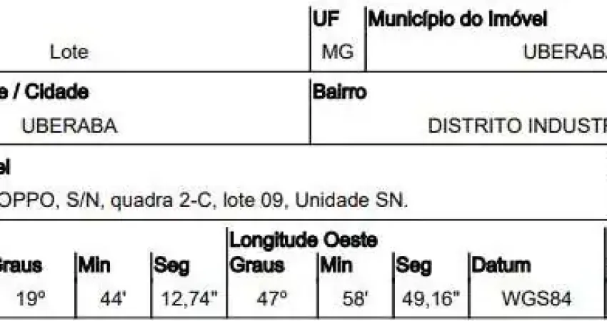 há Indícios de Contaminação. o Imóvel Está Localizado em Bairro Industrial, Próximo a Fábricas de Ração, Compensados e Laminados, Usinas de Concreto e Reciclagem de Pneus, Dentre Outras. no Cadastro Municipal, o Imóvel Recebeu o nº 244 Baixar edital e anexosRUA AFONSO RICCIOPPO,N. 00 QD 2-C, LT 09, DISTRITO INDUSTRIAL I - CEP: 38056-625, UBERABA - MINAS GERAIS**